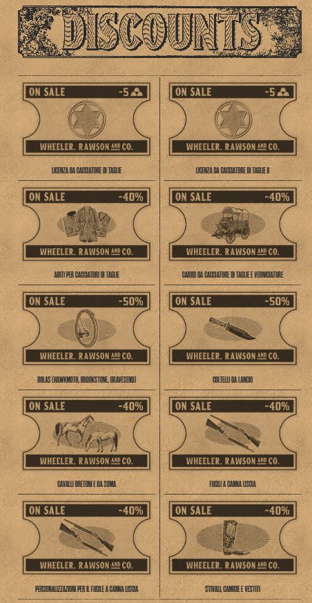 Pattugliare la frontiera con licenza di uccidere è una cosa seria: questo compito importantissimo non può essere affidato al primo bifolco con una rivoltella. I Cacciatori di taglie hanno bisogno delle giuste qualifiche, e abbiamo 5 Lingotti d’Oro di sconto sia sulla Licenza da Cacciatore di taglie che sulla Licenza da Cacciatore di taglie II. Approfittane per metterti in regola e inizia la tua caccia all’uomo.