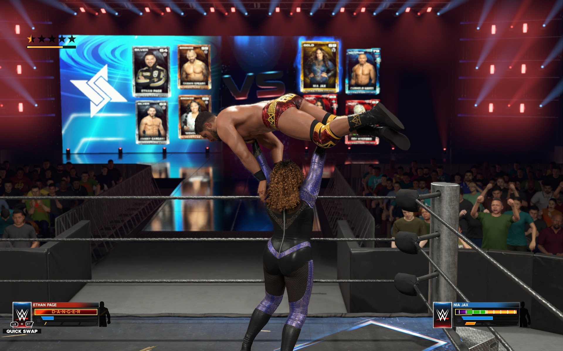 QuickSwap è la nuova tipologia di incontro che consente di cambiare Superstar in tempo reale durante il match, con un effetto quasi da teletrasporto. L’obiettivo è mettere KO tutti gli avversari, ma ciò che rende interessante questa variante è la sua svolta tattica: Signature e Finisher sono condivise, mentre la barra della salute resta separata.