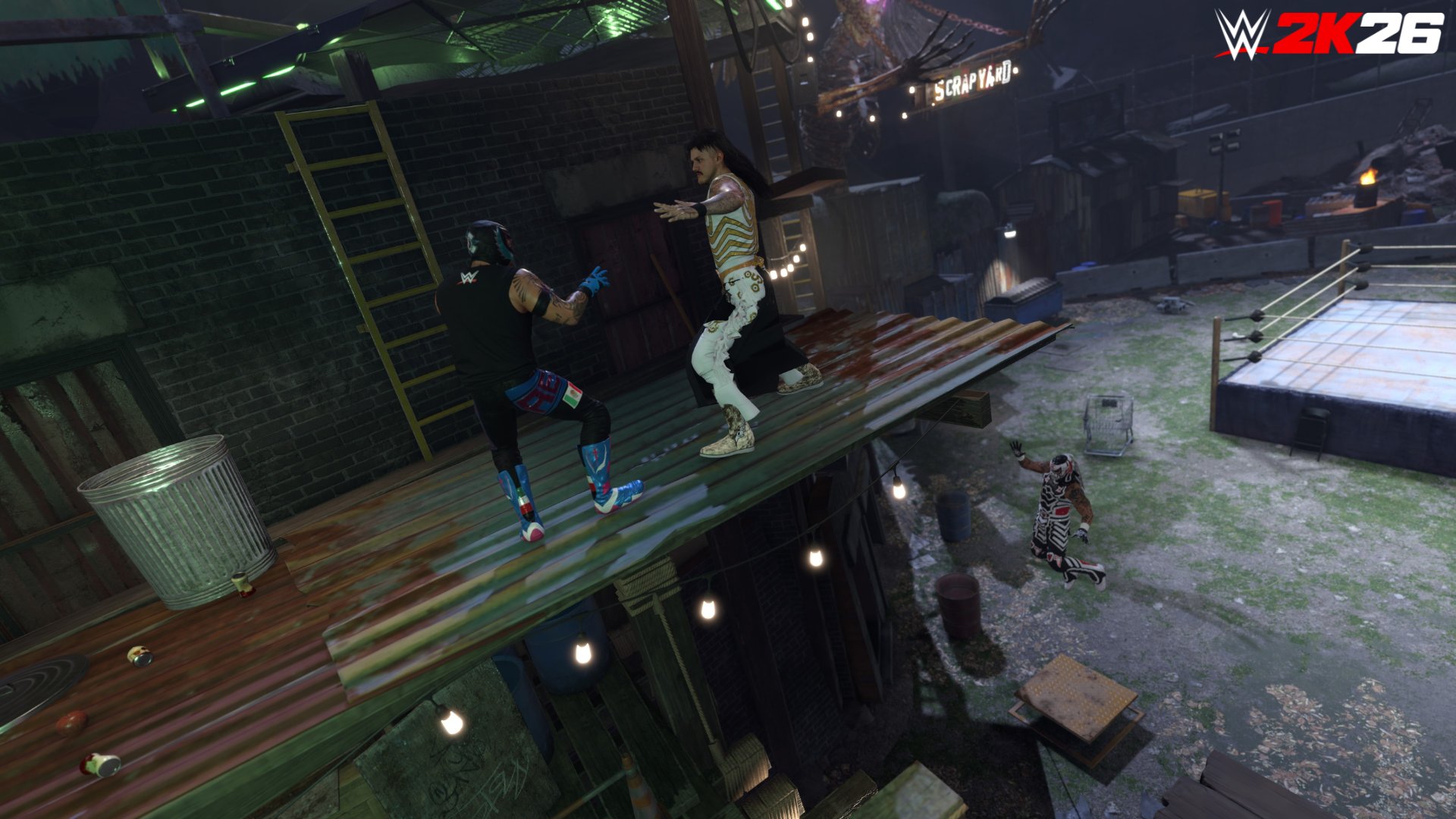 Sul fronte del gameplay, The Island introduce una nuova zona: The Scrapeyard, sorta dalle rovine del campo di battaglia dove Roman Reigns fu sconfitto. Questa mappa offre una inedita verticalità negli scontri, con impalcature e piattaforme sopraelevate che permettono di lanciare gli avversari nel vuoto. Alcuni momenti riescono a regalare sano divertimento, e clip perfette per i social, ma la caoticità dell’arena non mi ha permesso di apprezzarla fino in fondo.